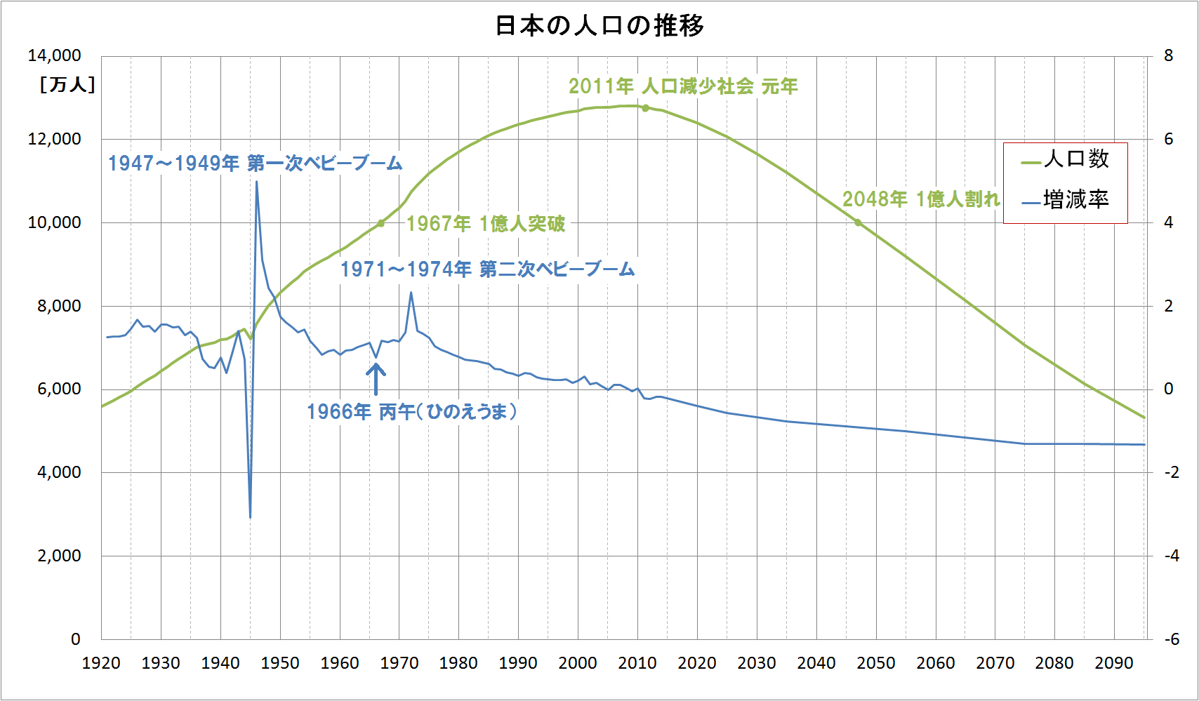 1920年時点で5600万人程度だった人口が、1967年に1億人を突破し、2010年の1億2800万人をピークに徐々に減少し、現在の日本の人口はおよそ1億2700万人。2011年は「人口減少社会 元年」と呼ばれることもあるそうです。そして2048年頃には1億人を切ってしまうと予想されています。