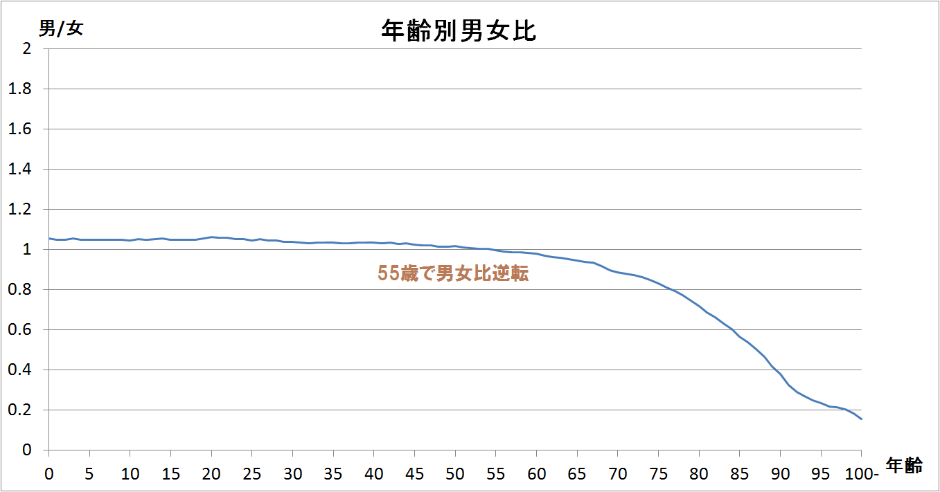 生まれてくる時点では、男女比はおよそ1.05:1、つまり男が105人生まれるのに対して女は100人生まれます。この割合は昔から変わっていないらしい。そして、54歳までは男の人数の方が多いけれど、55歳で男女比が逆転。さらに、87歳の時点で男性の数が女性の半分になり、94歳で4分の1、100歳以上に至っては、女性が5万1千人生きているのに対して男性が8000人にしかいないという何とも悲しい数字に。