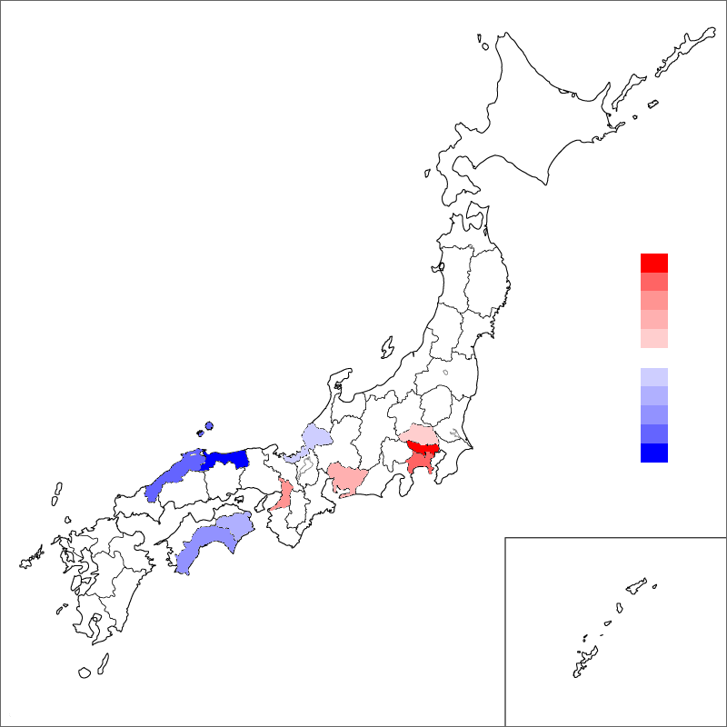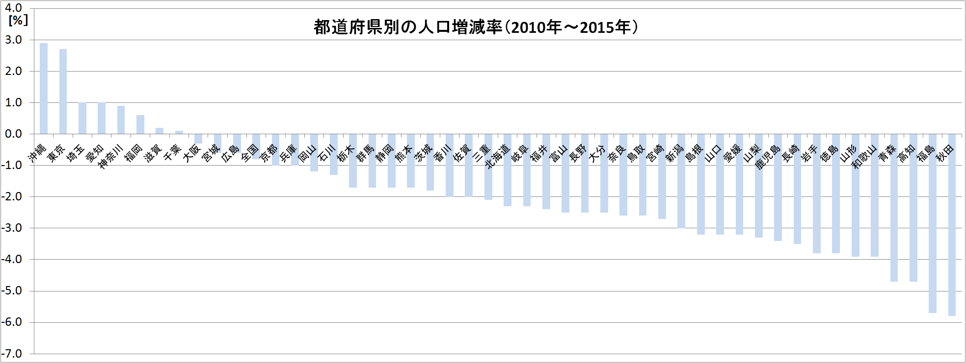 - 2010年~2015年の間の人口増加率が一番高かったのは沖縄県。一番低かったのは秋田県。