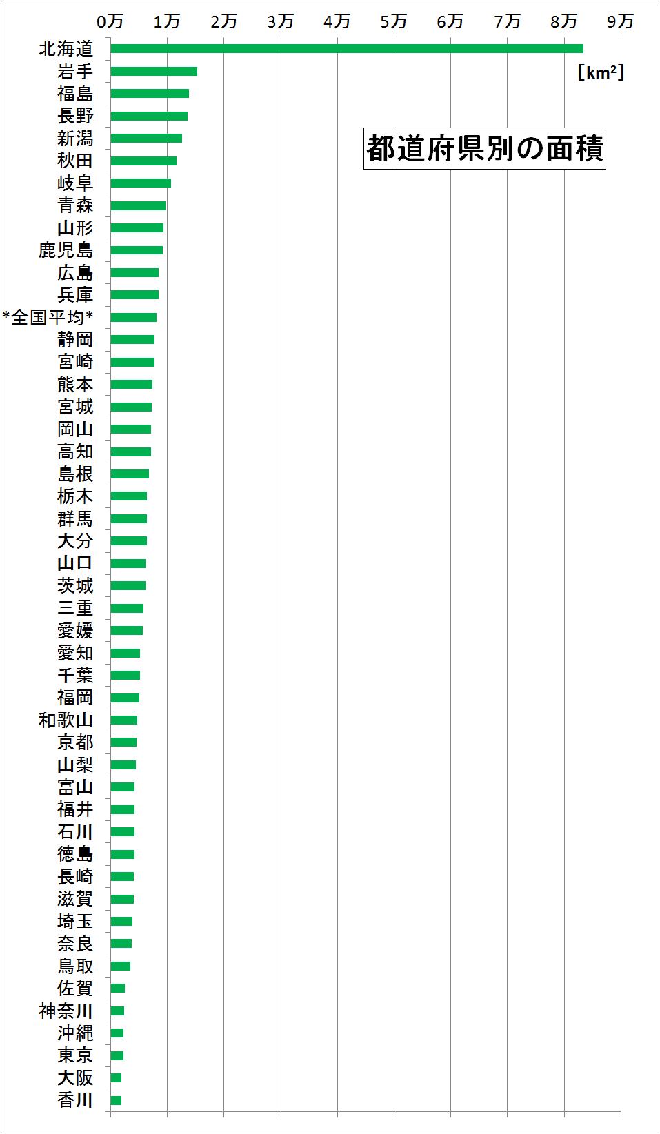 - 面積が最も大きいのは北海道。最も小さいのは香川県。北海道に香川が44個入る。