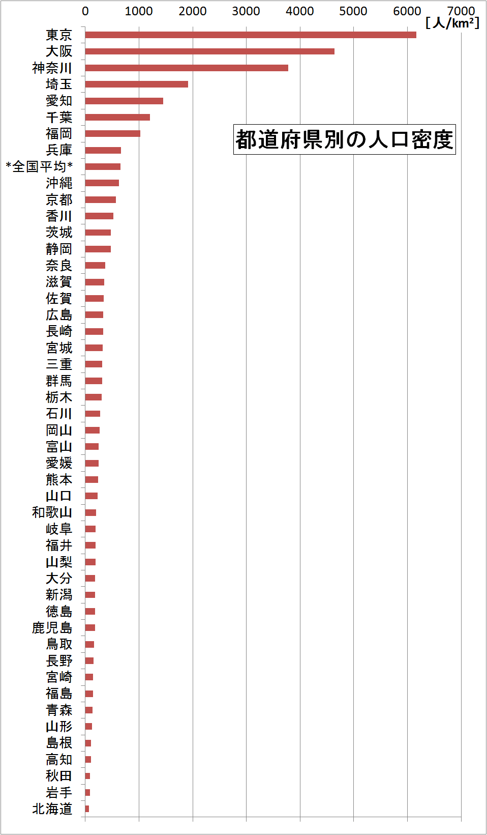 トップの東京の人口密度が約6200人/km2なのに対して北海道はなんと約65人/km2。なんと100倍近くの差があるんですね。そして現在進行形で東京の人口は増え、北海道の人口は減っていっているので、今後更に差が開く予定です。