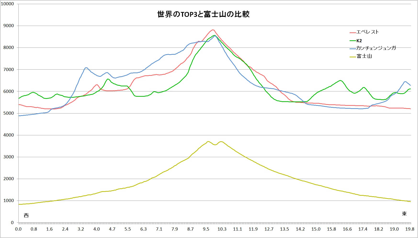 イマイチ分かりにくいけど、エベレスト,K2,カンチェンジュンガ,富士山の断面図の比較です。まぁ大体の形ですけどね。横軸は東西方向にぶった切った時の断面図で、単位はキロメートル。