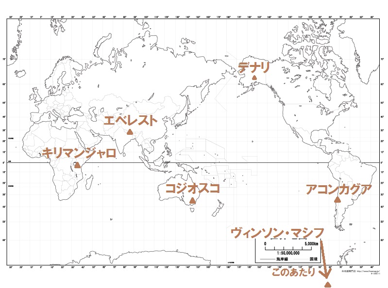| 南極大陸 | ヴィンソン・マシフ | 4892m | エルズワース山地 | 南極半島 |