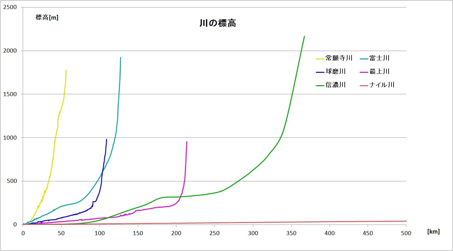 - 河床勾配:川の流れる方向の川底の傾きのこと。川の高さ11m上がるために必要な距離で表す。