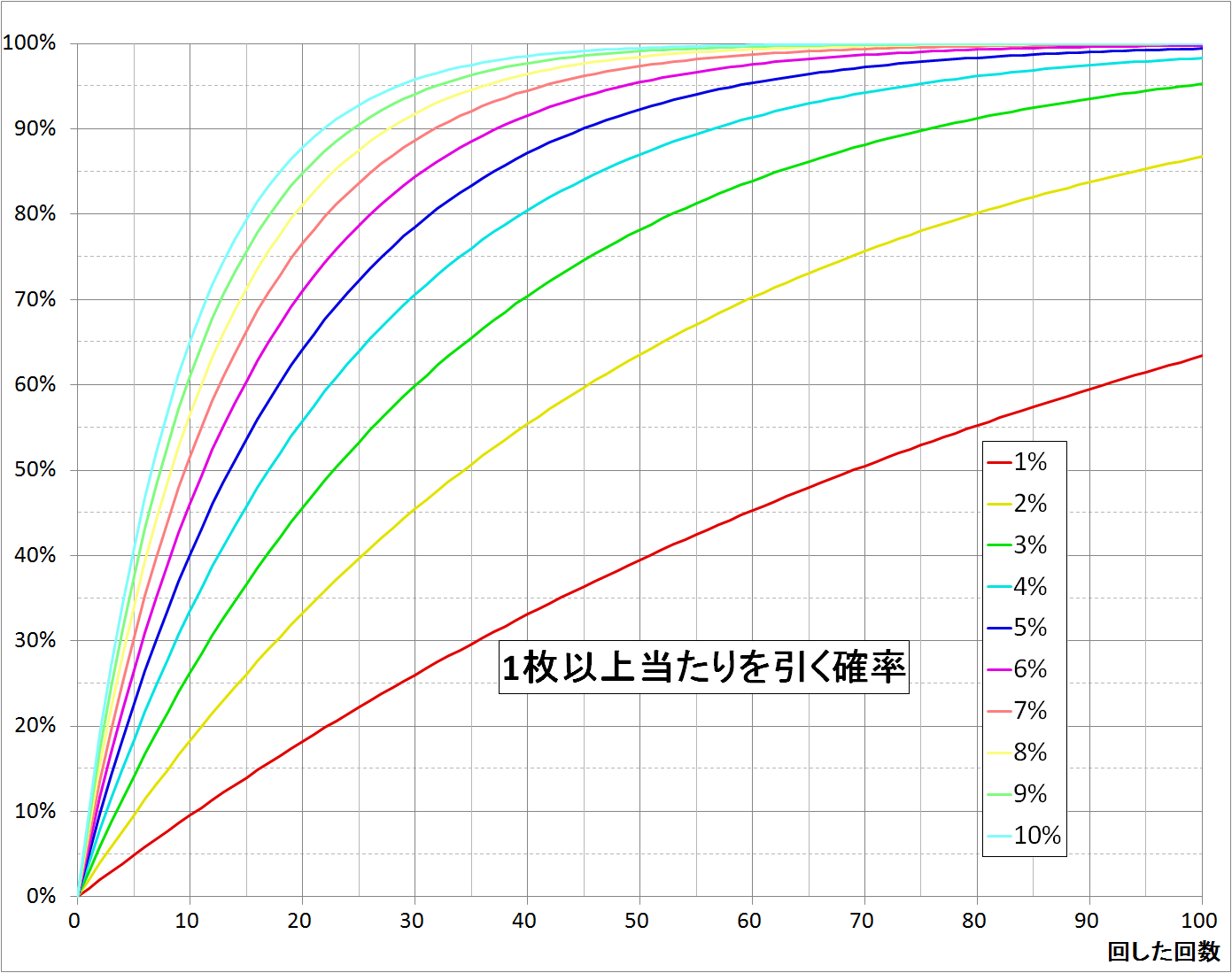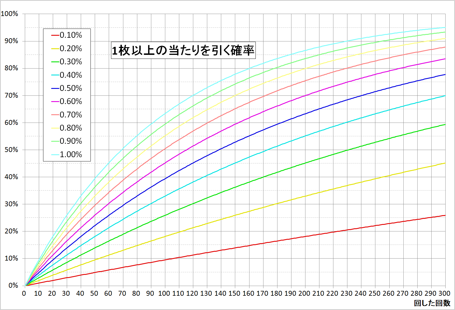 当たりが出る確率が0.1%、0.2%、0.3%…1%のガチャをそれぞれ引いた時に、1枚以上当たりが出る確率をグラフ化してみた。