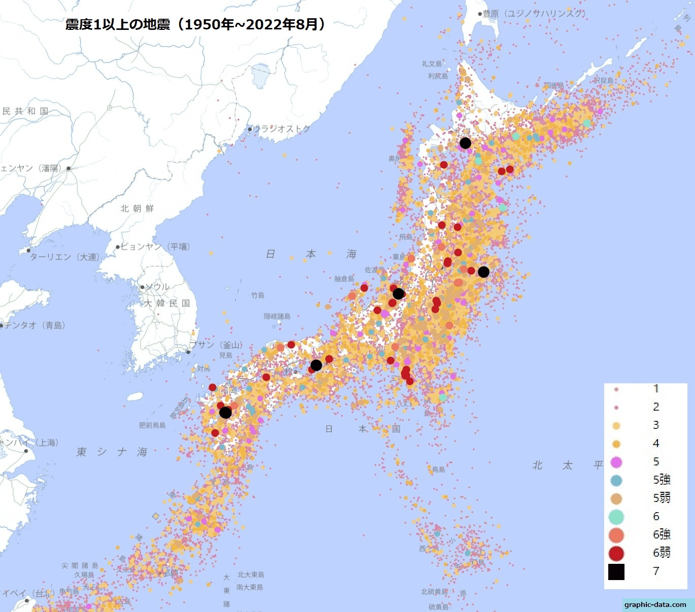 1950~2022年8月22日の震度1以上の地震を記録したものです。1949年に震度7が設定されて以来、震度7を記録したのは、1995年1月の兵庫県南部地震(阪神・淡路大震災)、2004年10月の新潟県中越地震(新潟県中越大震災)、2011年の東北地方太平洋沖地震(東日本大震災)、2016年の熊本で2回、そして2018年9月の