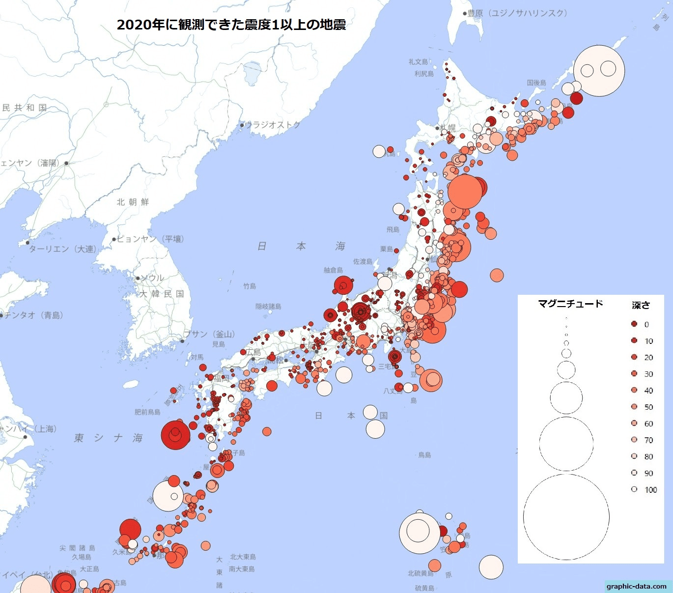 シンボルの大きさを合わせるとこんな感じ。こちらもやっぱり海のど真ん中の地震の観測はまだ不十分なのかな?