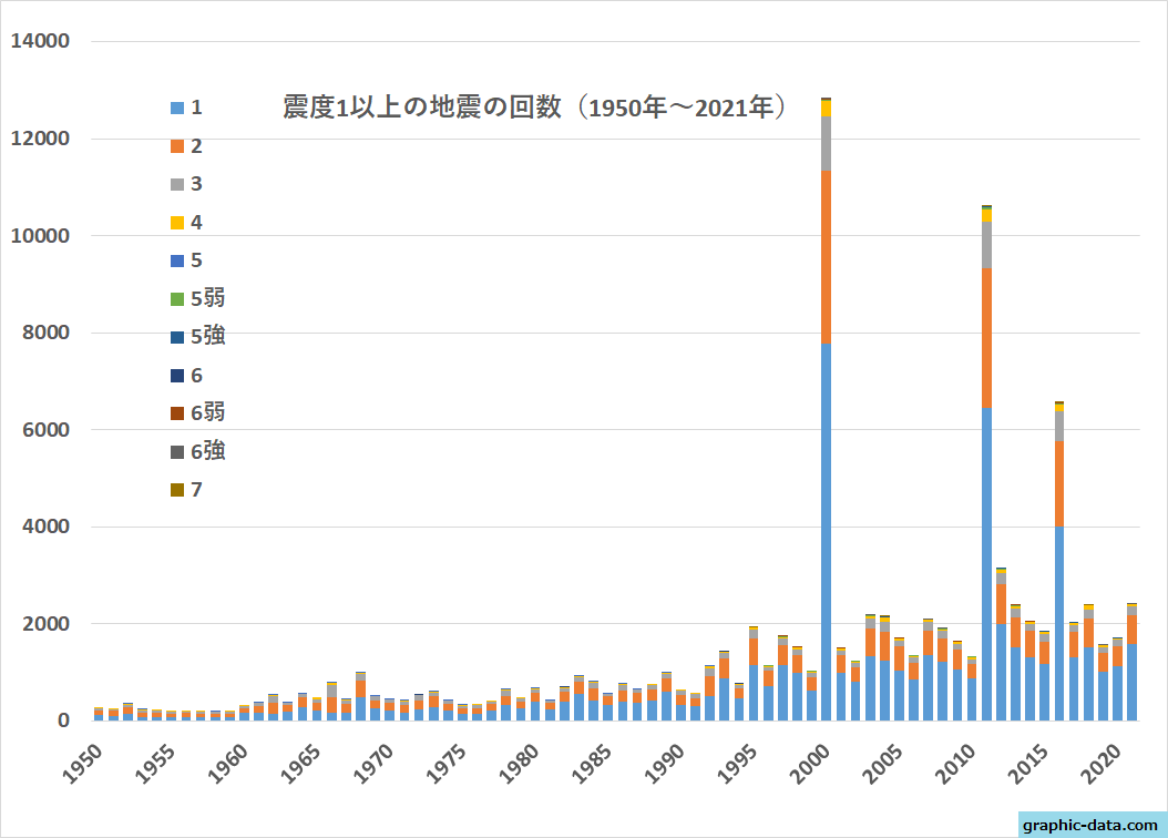 一番多かったのは2000年で1万3000回近く地震が起きたようです。この年には鳥取県西部と三宅島・新島・神津島近海で大きな地震があったのでその余震でしょうか?記録では鳥取県の地震は最大震度6強、三宅島・新島・神津島近海の地震は最大震度6弱が2回起きたそうです。