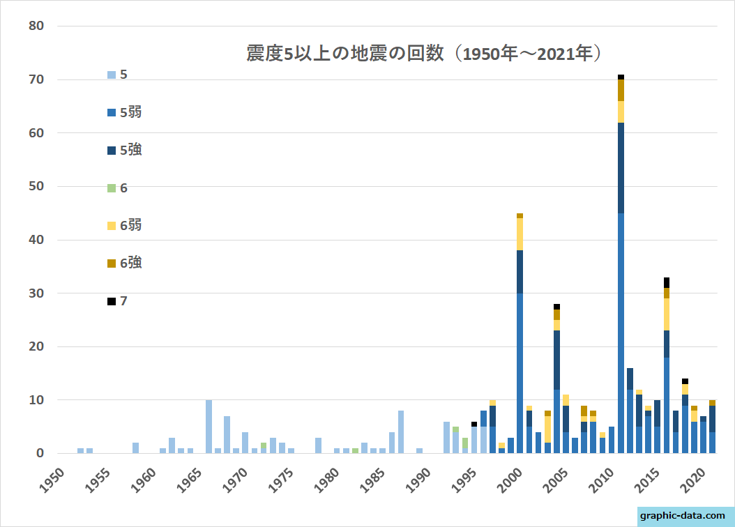 1970年から2021年の間に観測されたマグニチュード5以上の地震はおよそ8万2000回、年間およそ1600回、1日5回くらいですね。