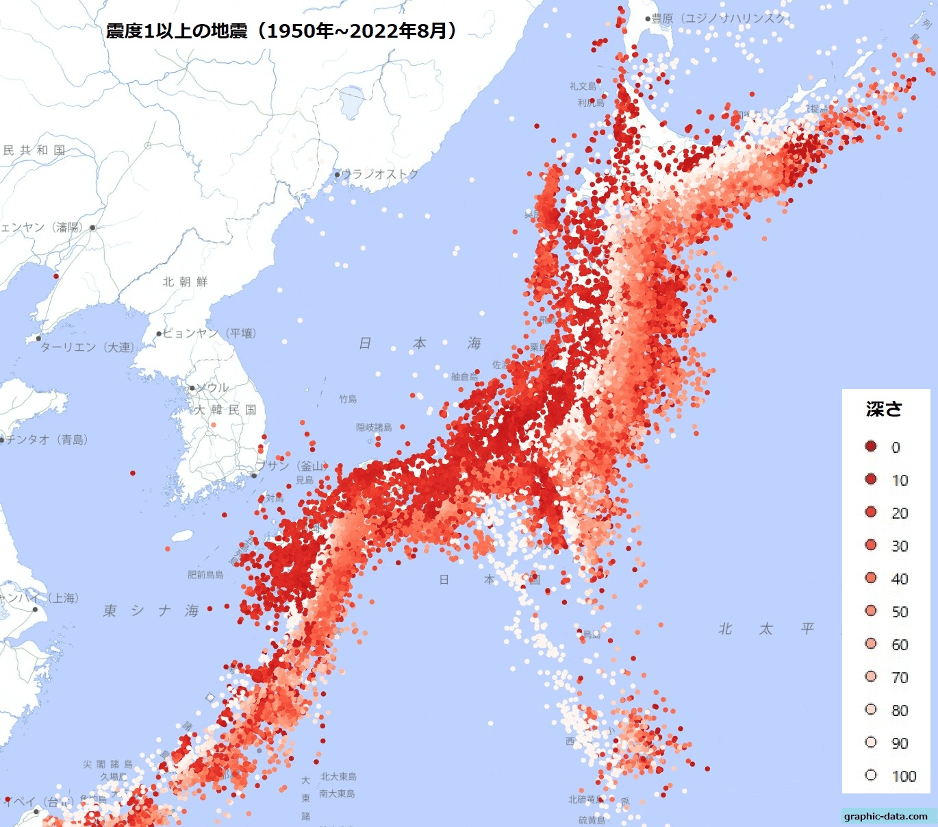 こっちは1950年から2022年8月に観測された震度1以上の地震です。海の上は観測が難しいのか、深い場所で起きた大きめの地震ばかり記録されています。