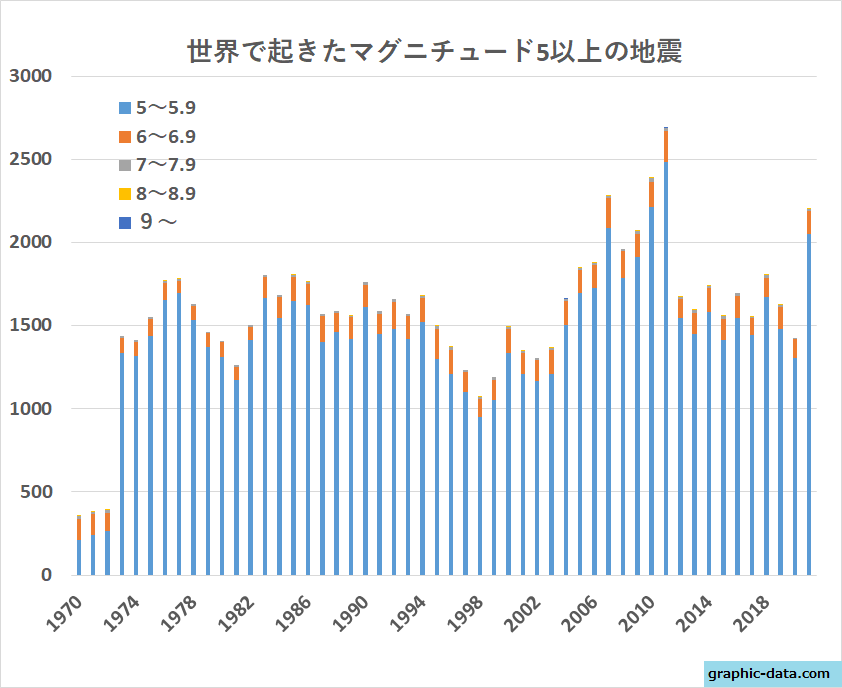 - 世界ではマグニチュード5以上の地震が1日平均5回くらい起きている