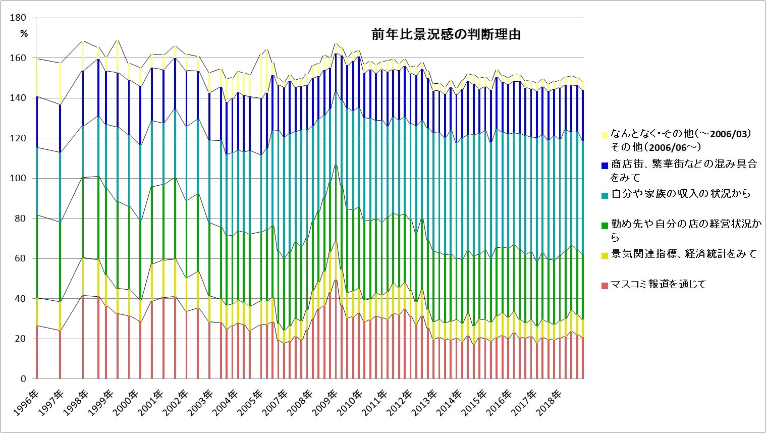 難しい書き方してるけど要するに「1年前と比べて景気はどうなってると思うか?の回答は何を根拠にしてますか?」ということ。2個まで複数回答可なので最大200%。2003年頃まで薄いのは今よりアンケートの頻度が低かったため。