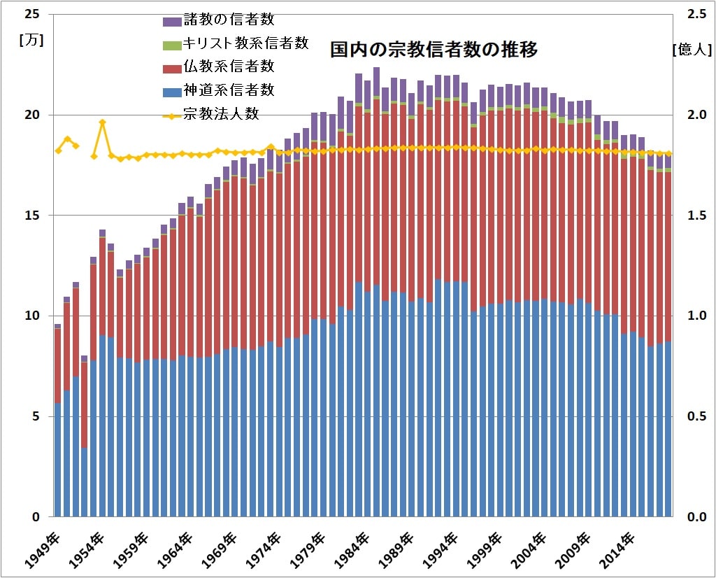 - 国内の総宗教信者数は1985年の2億2400万人をピークに若干の右肩下がりを続けている。2019年時点では1億8100万人!