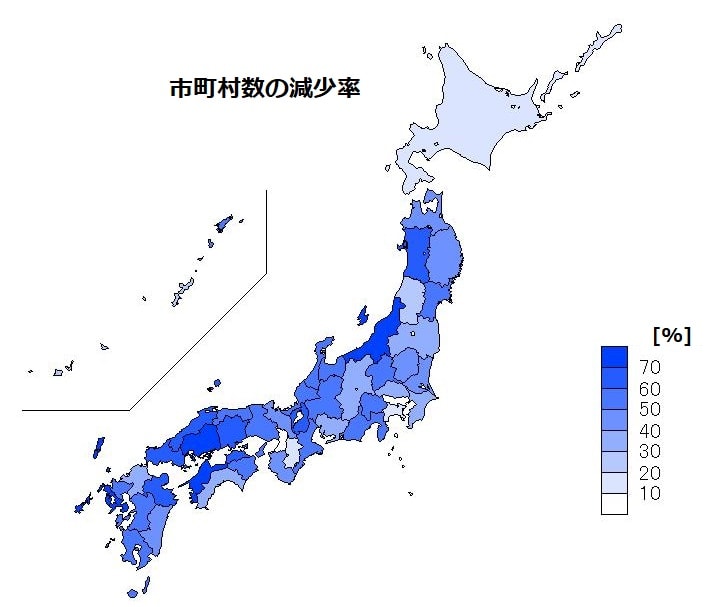 逆にあまり合併しなかったのは、1位が大阪府で減少率は2.3%、市町村数は44から43へと1つだけ減りました。2位は東京都で2.5%、こちらも市町村数が40から39へと1つ減っただけ。そして3位は神奈川県で減少率は10.8%、市町村数が37から33へと町が4つ少なくなりました。