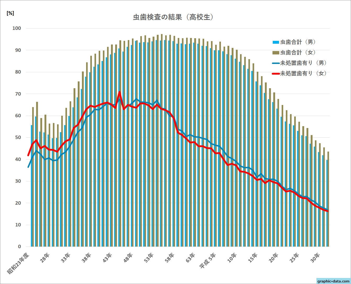 - 虫歯のピークは昭和55年で、高校生の約96%の人が虫歯になっていた!