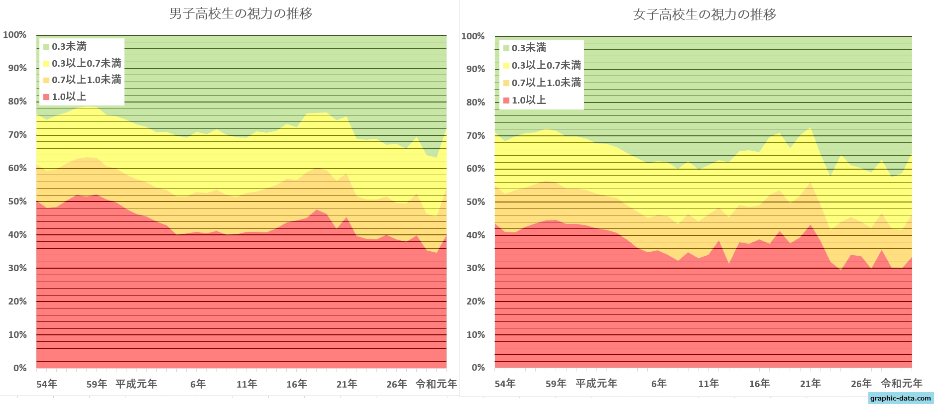 こちらも男女別に分けてみました。下の赤いところが視力1.0以上ですが、見ての通り男女ともに右肩下がりですね。