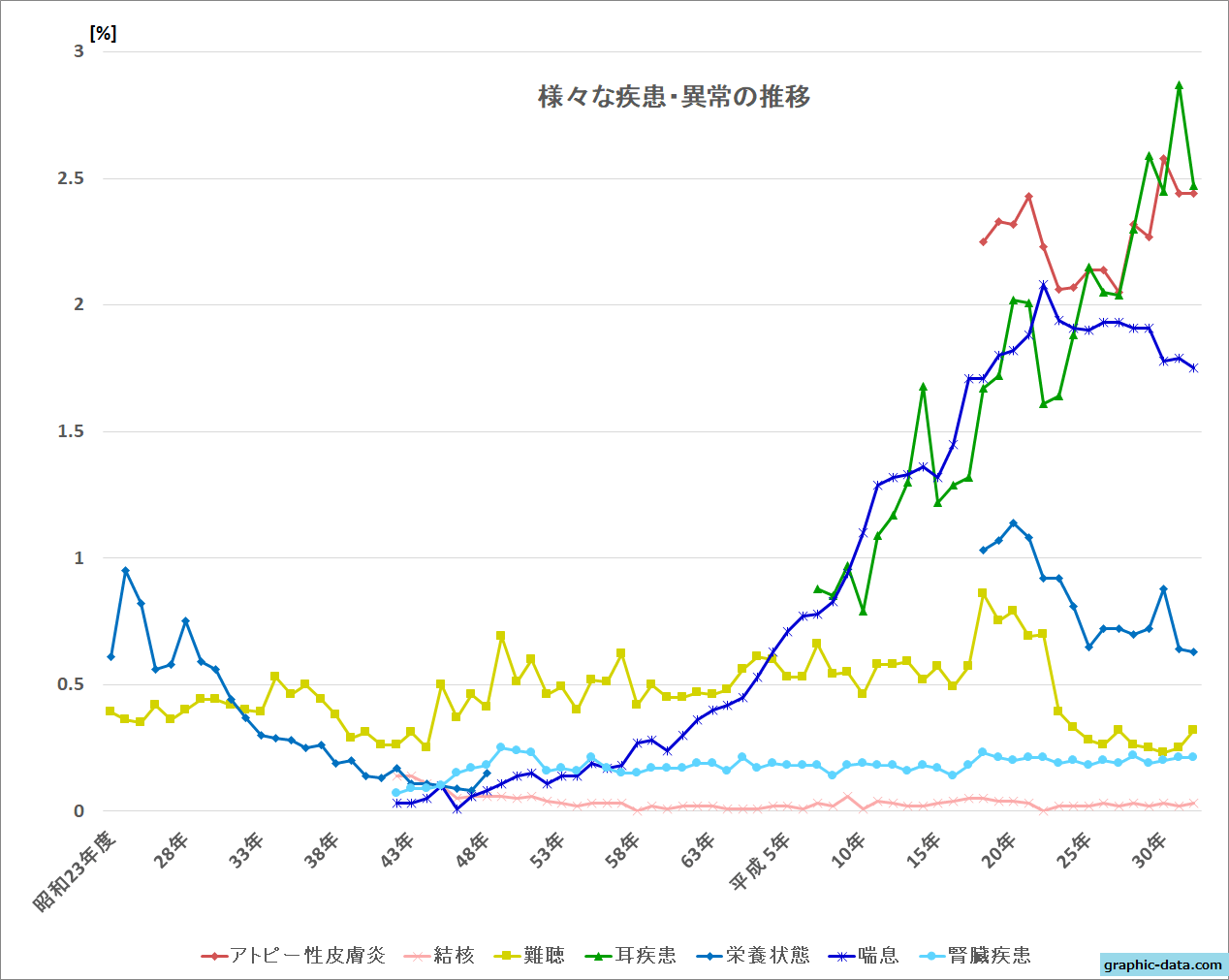 だいたい横ばいなのですが、喘息と耳疾患は大きく上昇。結核はもともと数が少なかったですが、現在ではほとんどいなくなったようです。あとは腎臓疾患が、もしかしてちょっとずつ増えていってる?くらいです。